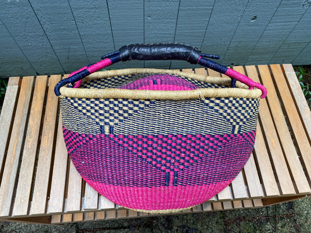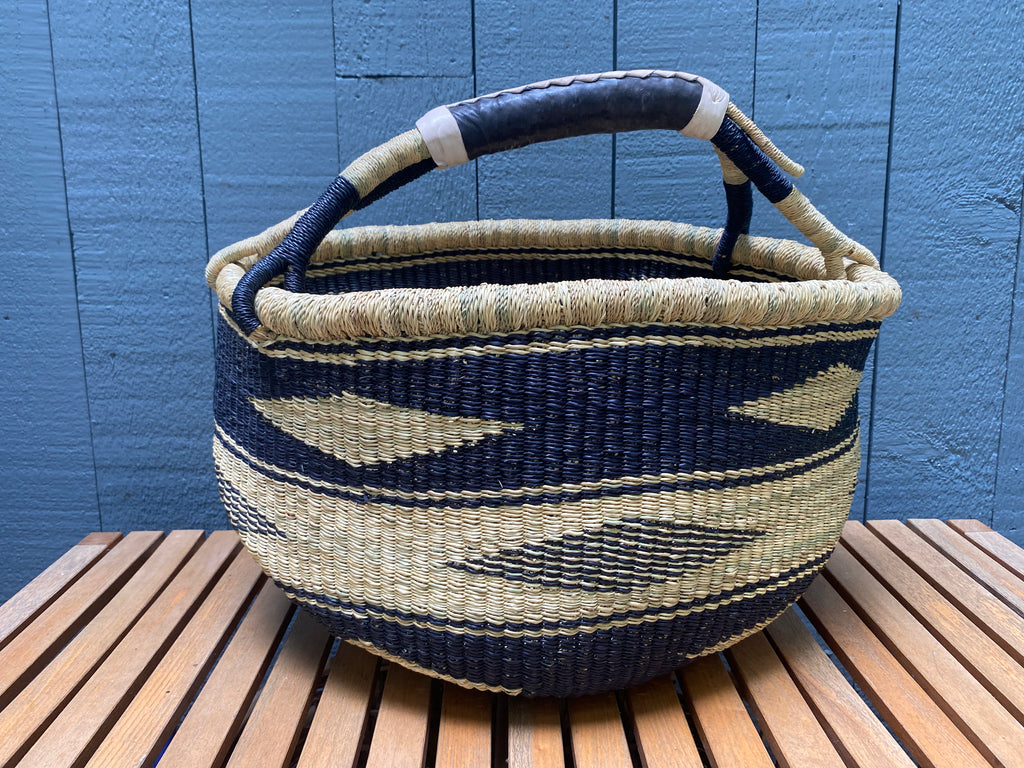 Woven by hand in Bolgatanga, northern Ghana, Africa, from hand-split and hand-twisted elephant grass. Uses for baskets are unlimited: picnics, shopping, toy chest, shoe storage, laundry, towels or a recycling bin. Very durable. As these baskets are handmade, some slight variations in size and colour occur.